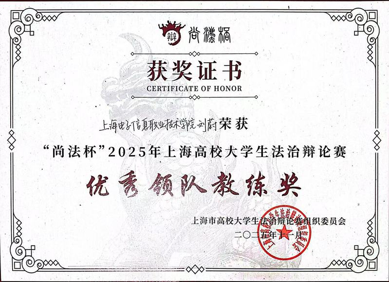赛场上,我校辩手身着正装、从容自信,在开篇立论环节逻辑清晰地阐述观点,以扎实的法理依据搭建论证框架;质询与自由辩论环节中,他们反应敏捷、言辞犀利,围绕辩题核心展开层层攻防,既精准捕捉对方逻辑漏洞,又巧妙结合行业特色与生活实际强化论证,展现了对法治热点问题的敏锐洞察与深入思考。面对高校的强劲对手,队员们默契配合、沉着应战,用理性思辨与生动表达赢得了现场评委与观众的认可。在与上海立信会计金融学院的对决中,我校学子徐佳楠荣获全场最佳辩手,并获得本次赛事的“优秀辩手奖”。刘蔚老师也荣获本次赛事的“优秀领队教练奖”。