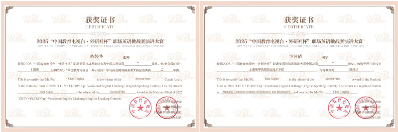 12月21日,2025“中国教育电视台・外研社杯”职场英语挑战赛演讲大赛在北京圆满收官。我校学子卞茜倩作为上海赛区唯一晋级北京线下决赛的选手,凭借扎实的语言功底、沉稳的赛场表现,一路过关斩将,最终斩获全国二等奖,指导教师陈婷华获全国决赛指导二等奖!